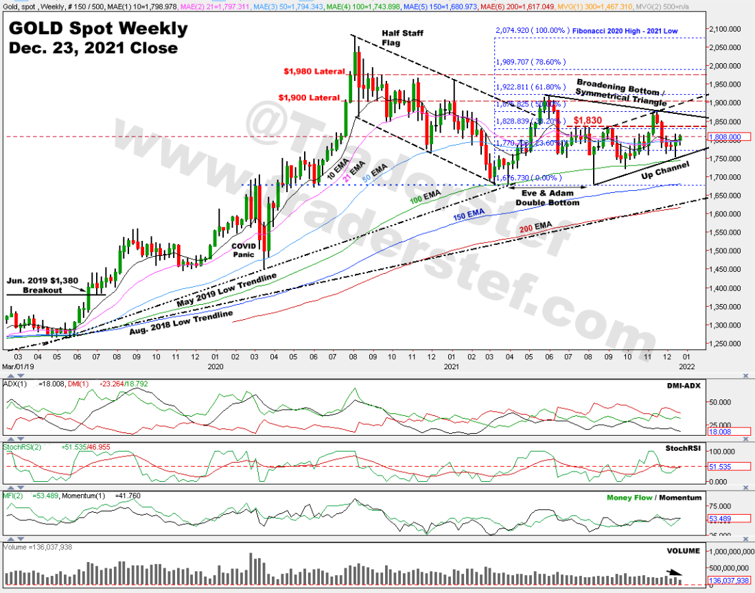 Despite the failure of that rally through $1,830, the price action continues its ride above the 100 Exponential Moving Average (EMA) and printed two higher lows that form a Symmetrical Triangle / Broadening Bottom pattern with an embedded Up Channel. The problem with lower highs since Aug. 2020, is that it reinforces resistance levels that must be taken out with conviction to manifest a sustained rally into early 2022. The technical indicators and studies are a mixed bag with bullish and bearish signals.