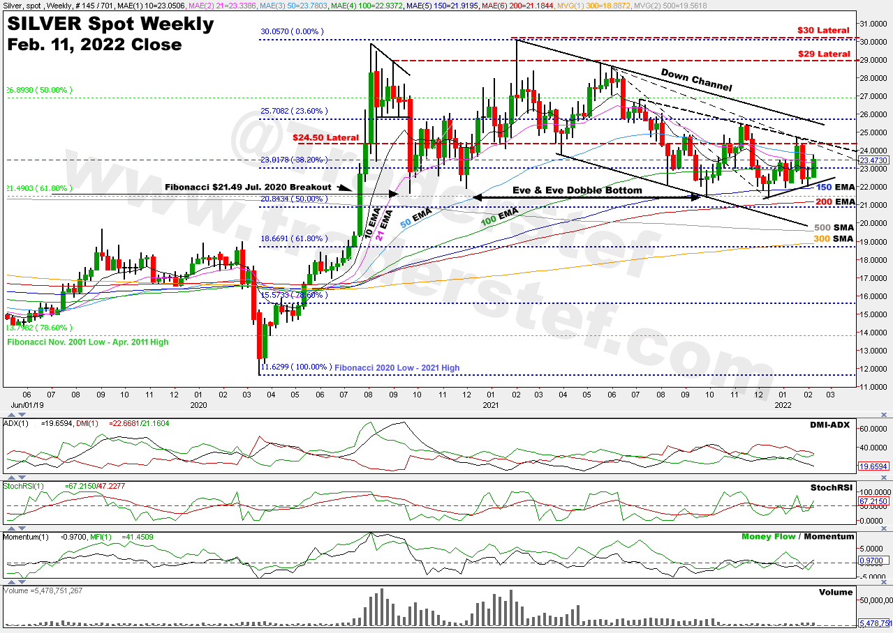 “Silver stackers and the silver squeeze crowd are not thrilled about the price action in paper markets, but demand for physical bullion, coins, and the premiums to purchase at retail are as elevated as last year… What has developed is a bullish Eve & Eve Double Bottom… Support at the $21.49 Fibonacci level has a substantial number of long positions beneath it… The price action is currently riding above the 150 EMA with near-term overhead resistance at $23… If $21.49 is breached to the downside on large sell Volume, expect a downward spike that is short-lived. Topside resistance going forward is $23, $25.70, then $29 and $30 for all the marbles.”