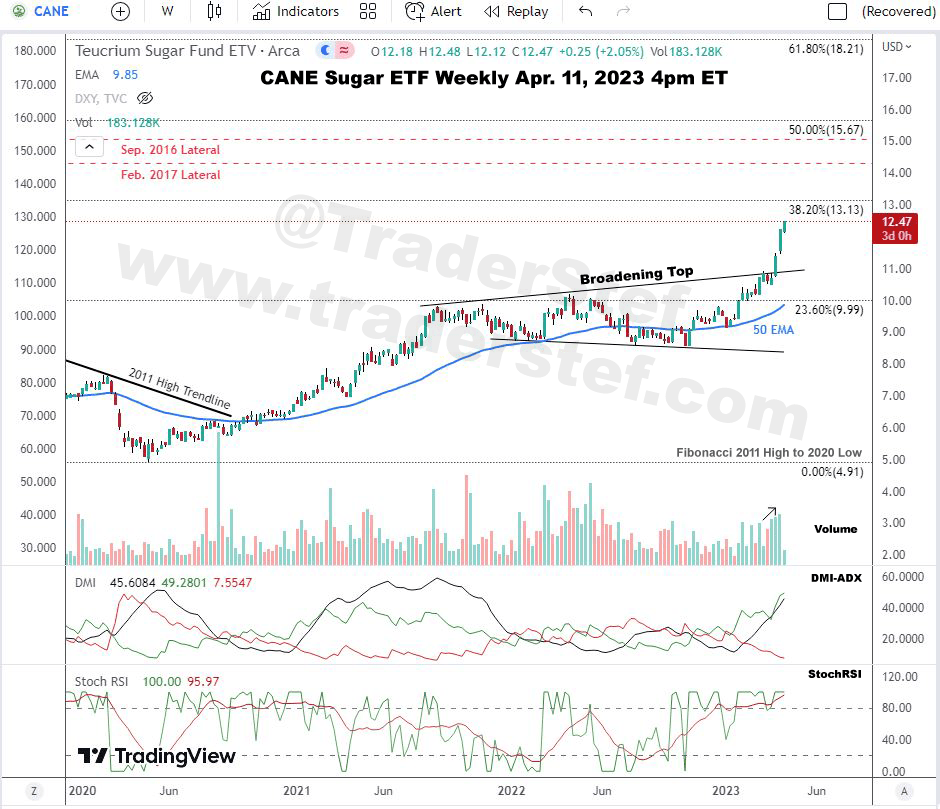 $CANE Sugar ETF weekly chart as of Apr. 11, 2023, 4pm ET…