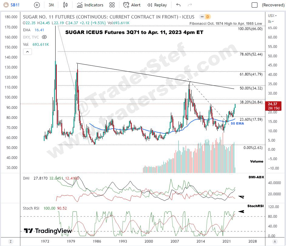 Sugar No. 11 ICEUS Futures quarterly chart 3Q71 to Apr. 11, 2023, 4pm ET…
