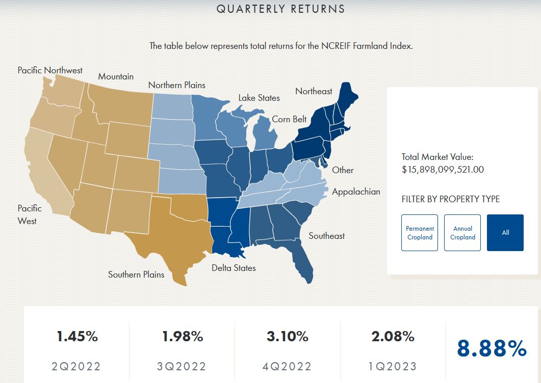 In the farmland arena, values vary by region, agricultural use, and quality of the land. According to the National Council of Real Estate Investment Fiduciaries (NCREIF), YoY returns as of 1Q23 were 8.88%. Despite weaker grain markets and high interest rates, farmland is holding strong relative to other asset classes.