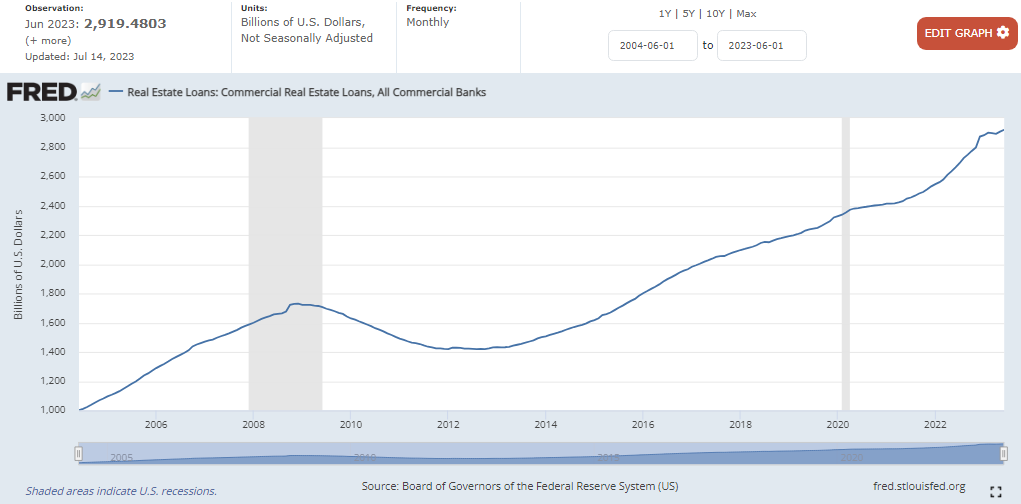 The implosion of commercial real estate (CRE) sparked by office space vacancy rates during the pandemic and a remote work from home (WFH) culture has accelerated in several major metropolitan areas this summer. A study from researchers at New York University and Columbia University found that offices in the city will lose at least 44% of their pre-pandemic value by 2029 primarily due to the impact of WFH. Across the country, values for offices have decreased by 27% since March 2022 according to data analytics company Green Street. Despite what the disastrous “Bidenomics” hopium narrative is selling, the U.S. economy is tumbling toward another great recession scenario. Numerous sources have cited since 2022 that the CRE market was the “next shoe to drop.” Here’s two excerpts from Part 2 (Twitter thread) published in May: