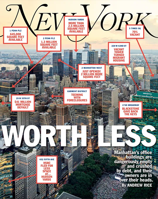 You know it’s getting nasty out there when behemoth JPMorgan is looking to sell a $350 million loan backed by Manhattan’s HSBC Tower because banks are facing increased pressure by regulators to reduce their exposure to office real estate. Case in point is Leser’s 111 Livingston in Brooklyn with a $120 million burning pile of debt dung that was watchlisted in May. Back in April, one of America’s largest office owners, Brookfield, defaulted on a $161 million loan that covered 12 office buildings in the Washington, D.C. market. They joined the world’s largest commercial property owner Blackstone, and WeWork defaulting on their debt this year. Visit Visual Capitalist to view a graphic of what the 1 billion square feet of vacant office space in the U.S. looks like.