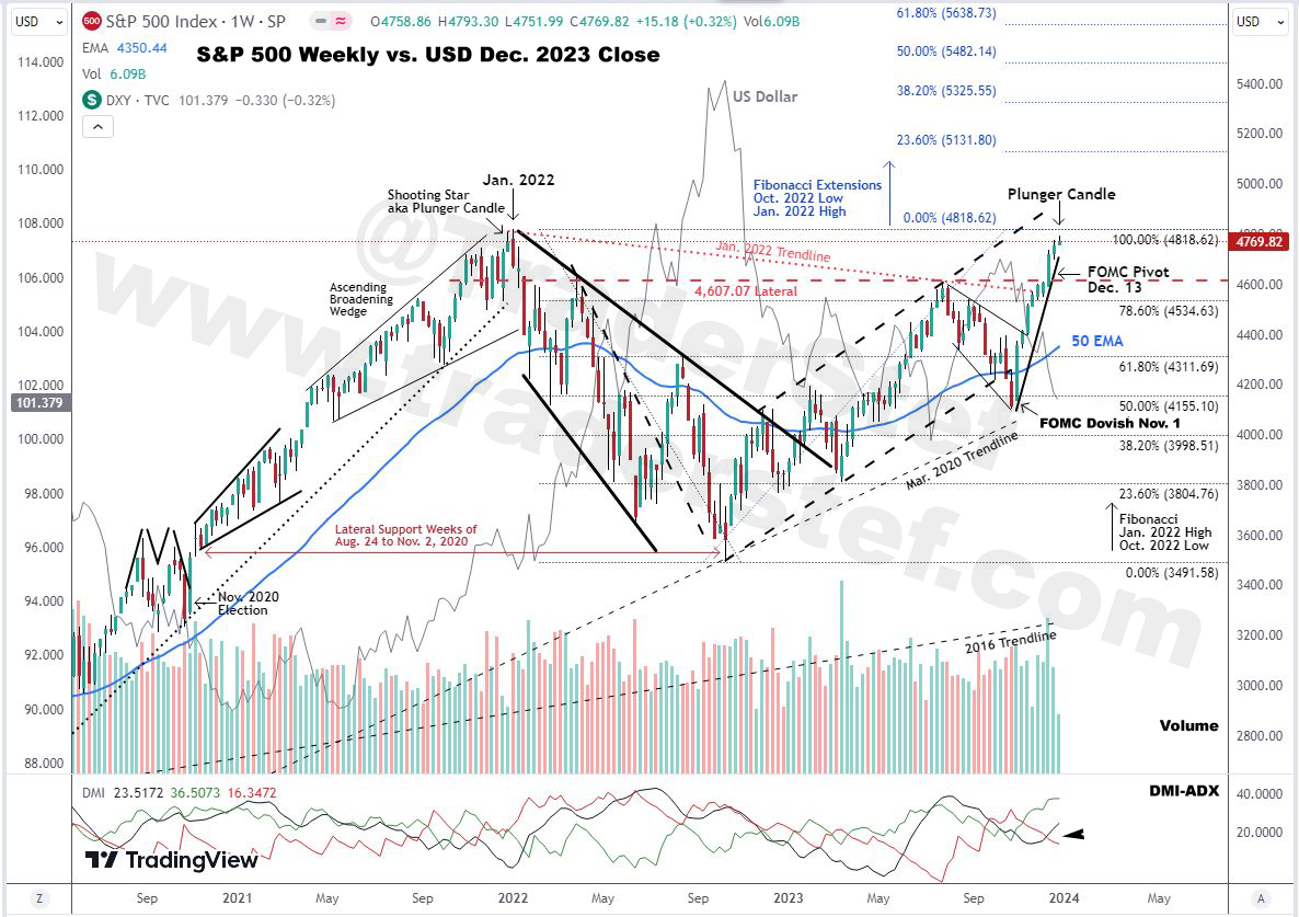 The rally is just as prominent and extended on the S&P, but the price action has not breached the Jan. 2022 high of 4,819. Since printing a 4,104 low in late October, the price spiked to a high of 4,793 this past week and is just shy of a 16.5% gain over 9 weeks. This week’s Plunger Candle at the close signals the potential for a pullback. Support is around the 4,607 lateral. The S&P closed for the week at 4,770.