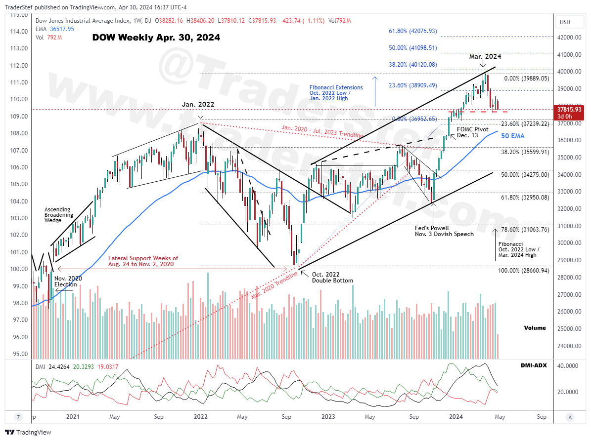 $DJI Dow Jones Industrial Index weekly chart as of Apr. 30, 2024…