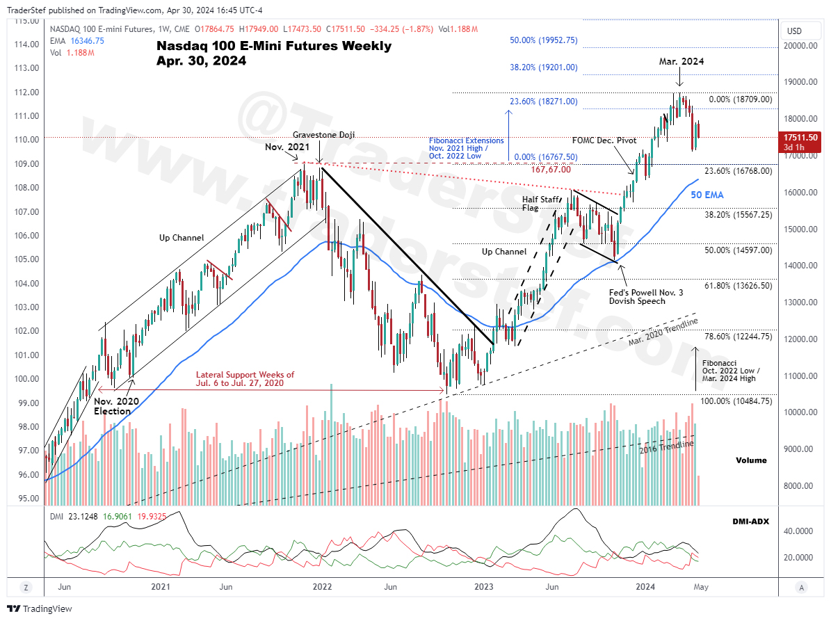 $NDQ Nasdaq 100 E-Mini Futures ($NQ1) weekly chart as of Apr. 30, 2024…