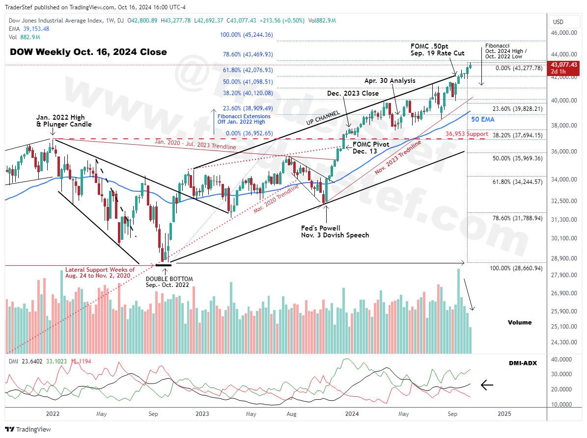 $DJI Dow Jones Industrial Index weekly chart Oct. 16, 2024 close…