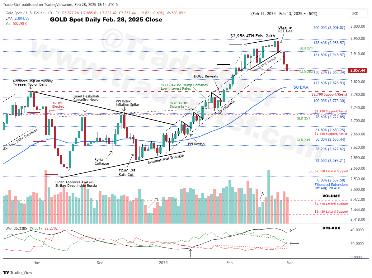 The most interesting aspect about the price action and patterns that develop on a price chart are their predictive nature, but they don’t tell you what news event may be a contributing factor on the next move in either direction. It was clear in mid-February that a breather was due in gold after a wicked $350 rally since mid-December extended too far beyond the 50 EMA. A bearish Ascending Broadening Wedge began to form above the Up Channel’s topside trendline, and quickly morphed into a more bearish Rising Wedge before a blow off buy Volume spike printed an ATH of $2,956 on Monday, Feb. 24. On that day, news began to appear about a potential mining deal between Trump and Putin that could open a path toward renewed diplomacy and peace that the Biden administration failed to pursue. On Feb. 25, headlines focused on an imminent deal between Trump and Zelensky for mining REEs in Ukraine. I believe those two events contributed to the price correction that began in earnest on Tuesday and fulfilled the need for a pullback and consolidation. The market viewed those negotiations as initiating a lasting peace deal for Ukraine which cooled the geopolitical risk factor that added fuel to the price of gold. It’s difficult to predict what the outcome will be after today’s debacle at the White House. We’ll know more as the weekend unfolds and see what the price action is at the open on Sunday evening and through next week.