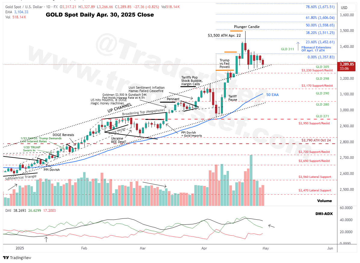 What a wild ride and historic April for gold, and a price consolidation is taking shape that mirrors seasonality to build support for a potential summer rally. Silver plunged into a Diving Board pattern two days after the Mar. 31 analyses, and an explosive buy-the-dip experience spiked gold to a $3,500 all-time high (ATH) following President Trump’s pause on reciprocal tariffs, his berating of “always too late” Jay Powell at the Fed for not lowering interest rates, recurring issues that impede peace negotiations on warfronts, and more fraudulent debt created by deep state government apparatchiks unearthed by DOGE.