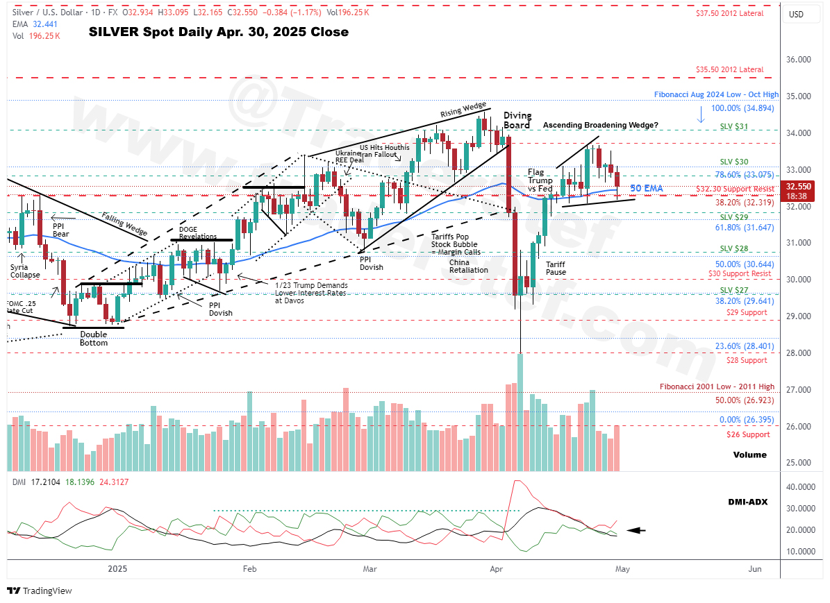 Silver’s Diving Board price action in early April is what you get when combining mindless algorithms with high-frequency trading platforms that push prices up and down across all markets in microseconds. Within days of noting a bearish Rising Wedge in the previous analysis, silver plunged nearly $6 in three days to $27.97 (nailed $28 lateral support) due to stock market bubble margin calls on tariff news and China’s retaliatory response. The buy the dip crowd have rallied the price back to $33.66 on decent buy Volume and is just in time for a seasonal consolidation process. The price action closed today at $32.58 while riding above the 50 EMA and $32.30 lateral since Apr. 14, with a potential Ascending Broadening Wedge forming after Trump ripped the Fed Chair for not lowering interest rates.