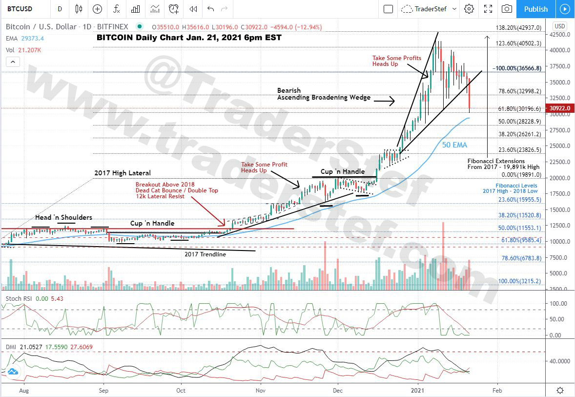 39) Jan. 21, 2021 – Bitcoin Daily Chart as of Jan. 21, 2021 6pm EST… breakdown away from bearish Ascending Broadening Wedge confirmed. See my Technical Analysis in post #38 above. $BTC Crypto Cryptocurrency.