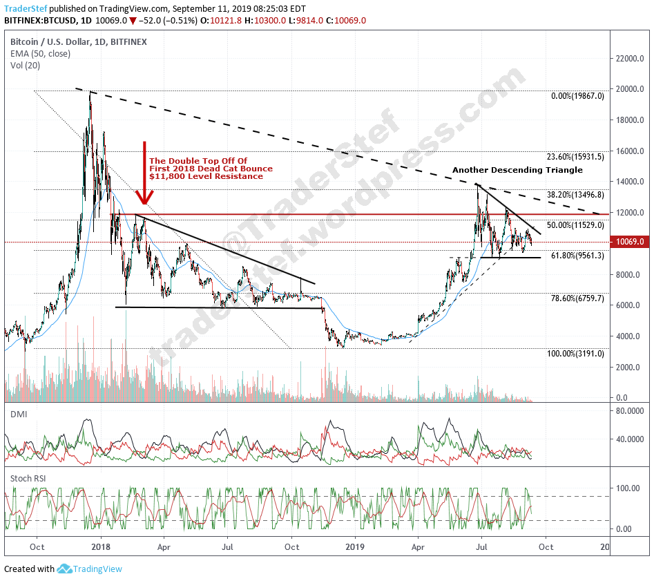 26) August 11, 2019 4:10am EDT – Repeatedly noted $11,800 (is now $11,600 due to plunge to $3,121 low, which reset the Fibonacci $ levels) as an important resistance level ever since, due to its significance as a first Dead Cat Bounce and subsequent Double Top, off of the $3,121 pivot low following the first plunge down from Dec. 2017 high #Bitcoin $BTC #TechnicalAnalysis #Fibonacci