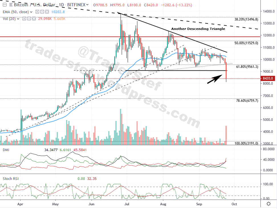 30) October 23, 2019 9am EDT – Bitcoin BTC Daily Chart… Bearish pattern called out on Oct. 18, confirmed today with a breakdown.