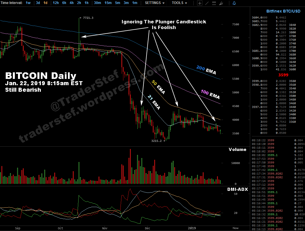 15) Jan. 22, 2019 8:15am – Ignoring plunger candlesticks is foolish – the chart remains bearish and requires many many thousands of $ to the upside to even show a hint of bullish… Jan. 25: JPMorgan: Bitcoin Is Worth Less Than the Cost to Mine It
