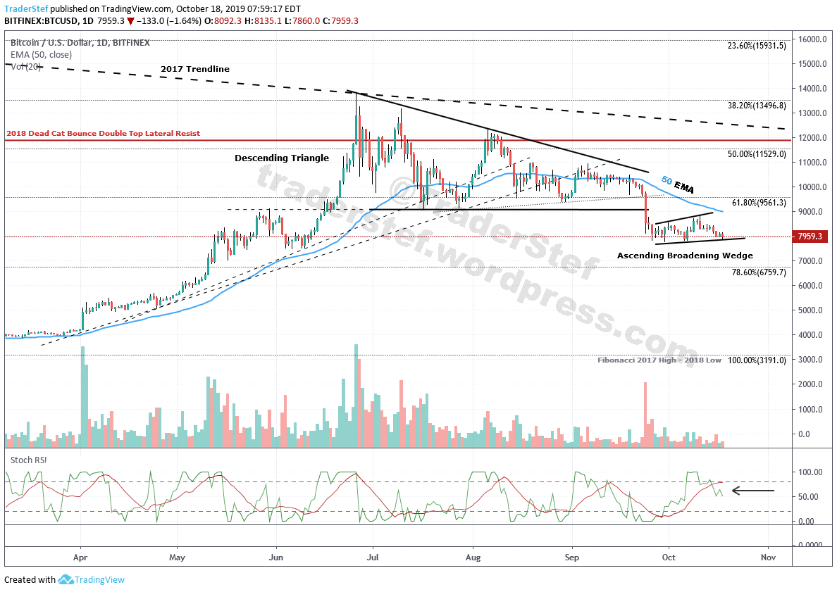 29) October 18, 2019 8am EDT – Bitcoin BTC Daily Chart… Ascending Broadening Wedge is bearish, odds lean to more downside price action.