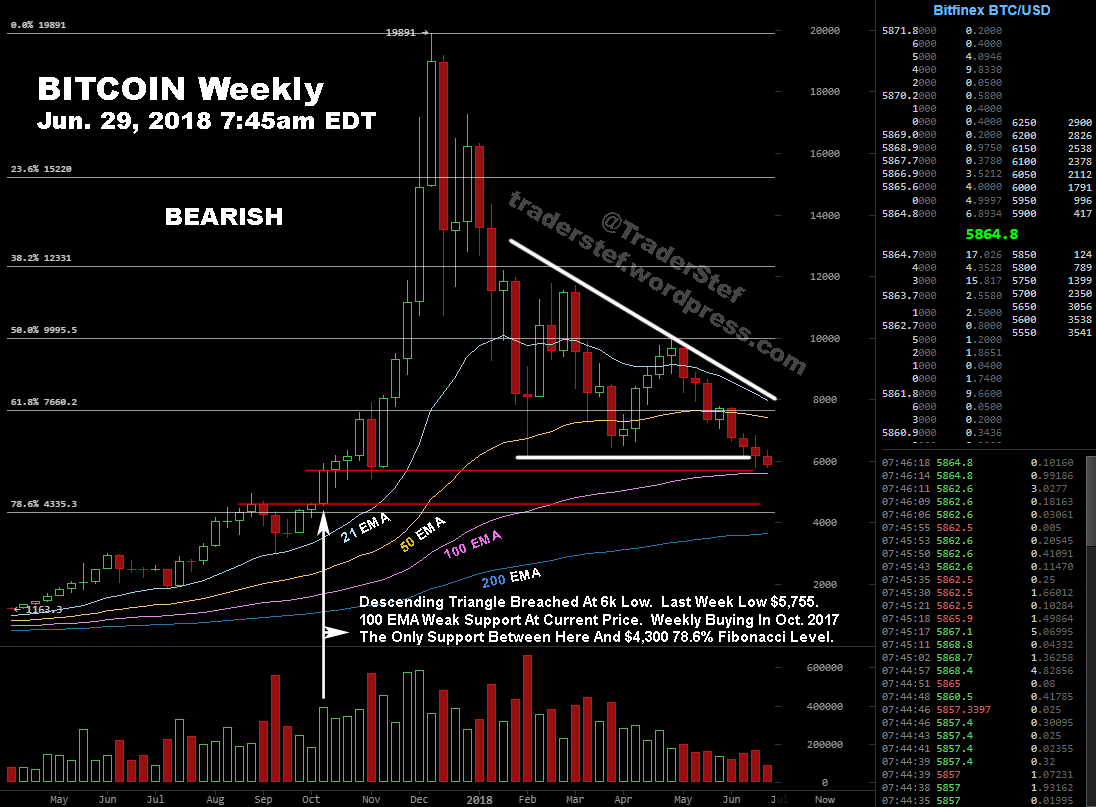 6) June 29, 2018 7:45am EDT – “Bitcoin Weekly, Descending Triangle breached at 6k low last week. Low $5,755. 100 EMA weak support at current price. Weekly buying in Oct. 2017 is the only support between here and $4,300 78.6% Fibonacci level.”