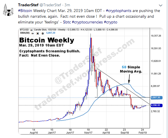 16) Mar. 29, 2019 10am EDT – Bitcoin Weekly Chart – cryptophants are pushing the bullish narrative, again. Fact: not even close ! Pull up a chart occasionally and eliminate your ‘feelings’ – $btc cryptocurrencies crypto.